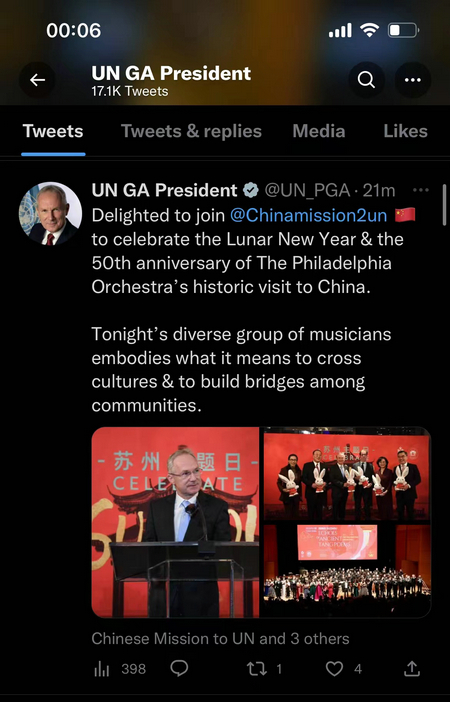 In his speech at the "Suzhou Theme Day" event before the performance, Kőrösi said the event continued the tradition of academic and cultural exchanges between China and the US, and reflected the significance of building communication between different cultural groups. He proposed to take practical steps in the right direction to bring peoples of the world closer together.
