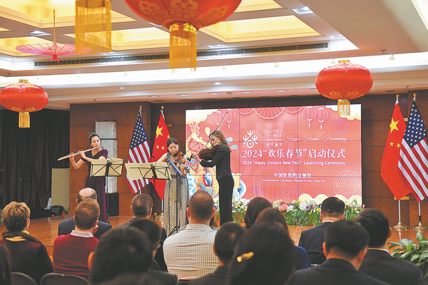Musicians from the New York Philharmonic perform at the Happy Chinese New Year launching ceremony at the Consulate General of the People's Republic of China in New York. [Photo/Xinhua]