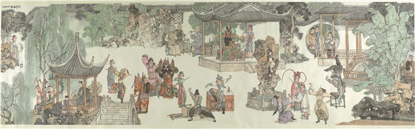 Measuring 6 meters wide and 1.8 meters high, An Operatic Mood by Han Shuo, depicts a daily scene at a Peking Opera garden with more than 30 performers in exquisite costumes, singing, reciting, acting and practicing. With rich expressions and diverse demeanors, the panoramic painting vividly showcases the profound and extensive Chinese opera culture. [Photo provided to China Daily]